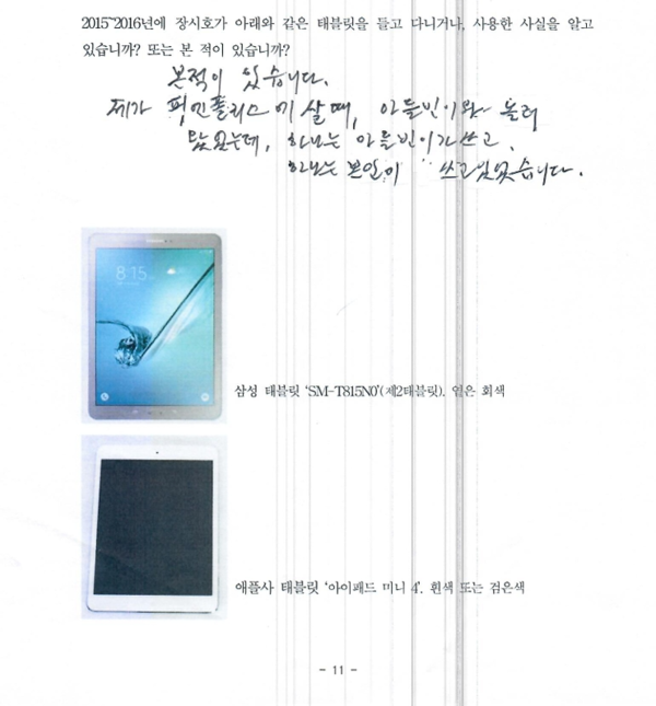최서원은 또한 해당 태블릿을 장시호의 아들이 사용하는 것도 기억하고 있다. 실제 장시호는 해당 태블릿을 최서원의 브라운스톤 거처에서 발견하여, 아들에게 주었다는 진술을 한 바 있다. 그러나 장시호는 브라운스톤 거처를 알지도 못했고 CCTV 상에서 발견되지도 않았다.
