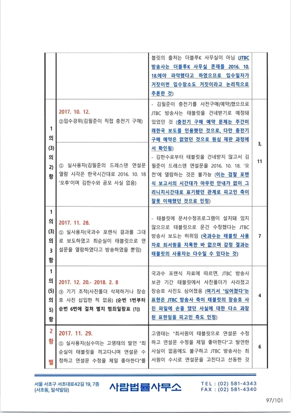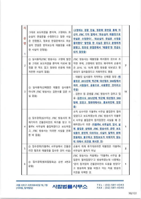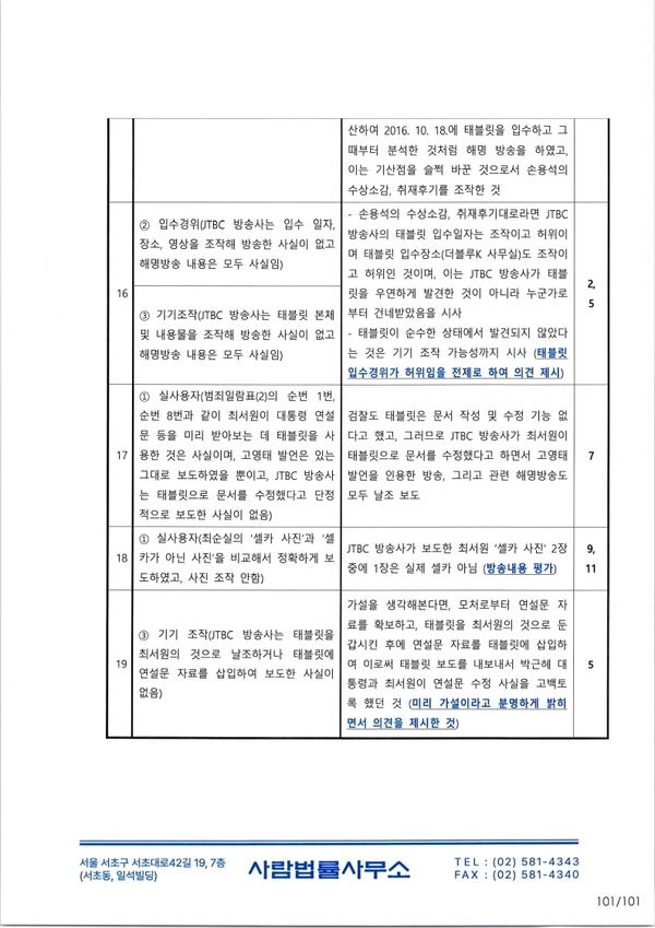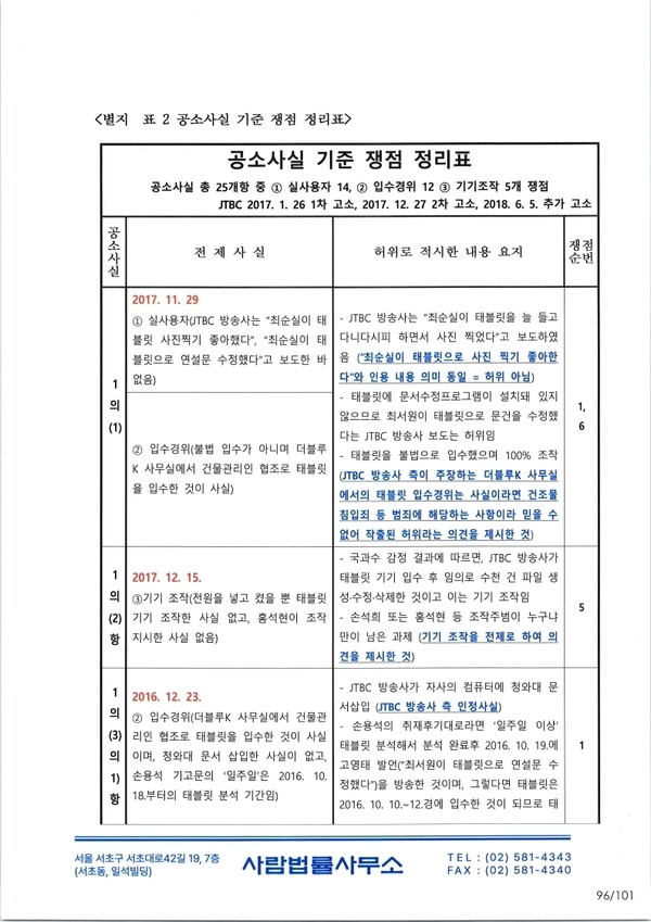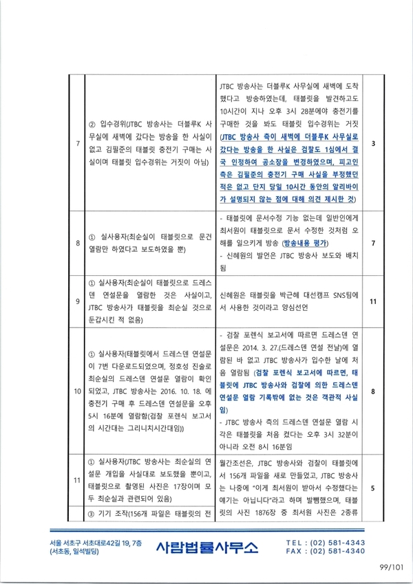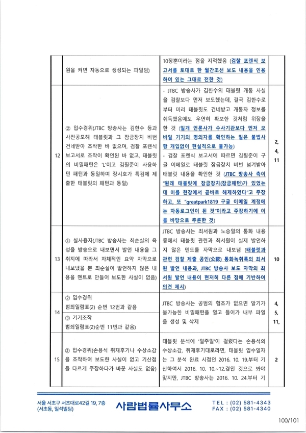 이어 “태블릿의 실제 사용자를 최서원으로 확정할수 없음은 국립과학수사연구소의 포렌식 결과에 의한 명시적 답변으로 확정된 사실이다. 이런 상황에 이르자 JTBC는 자신들의 방송내용에 대한 해석을 오로지 ‘태블릿으로 문건을 열람한 것’으로 전제하고 피고인의 방송내용을 허위라고 몰아세웠지만 원심에서 적법하게 조사된 증거 2개에 의하면 ‘최서원이 연설문 등을 태블릿으로 열람한 사실조차 없음’이 드러났다”고 주장했다.
