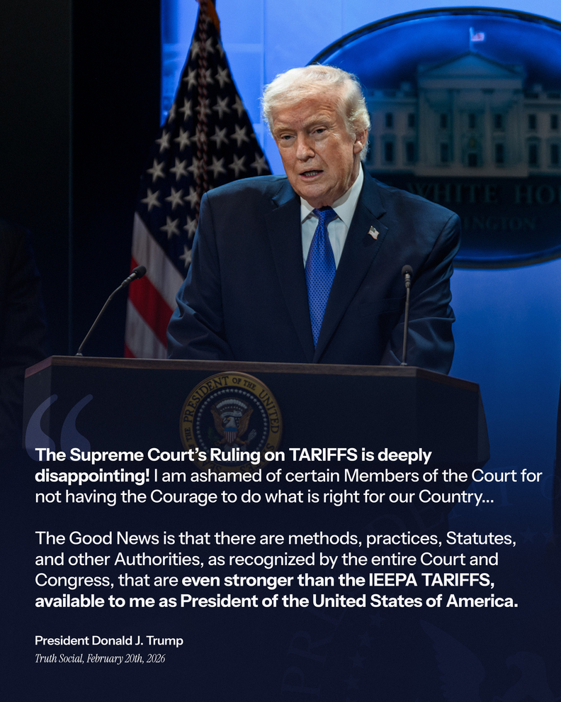 트럼프 대통령은 해당 판결이 나온 직후 트루스소셜을 통해 “매우 실망스럽다. 일부 대법관들이 미국을 위해 옳은 일을 할 용기가 없었다는 사실에 부끄럽다”며 “(토마스, 알리토, 카바노 대법관의) 반대 의견을 읽어보면 누구도 반박할 수 없었을 것이다. 지금 수년간 우리를 착취해 온 외국인들이 환호하며 거리에서 춤을 추고 있겠지만, 그들의 기쁨은 오래가지 못할 것”이라고 말했다.