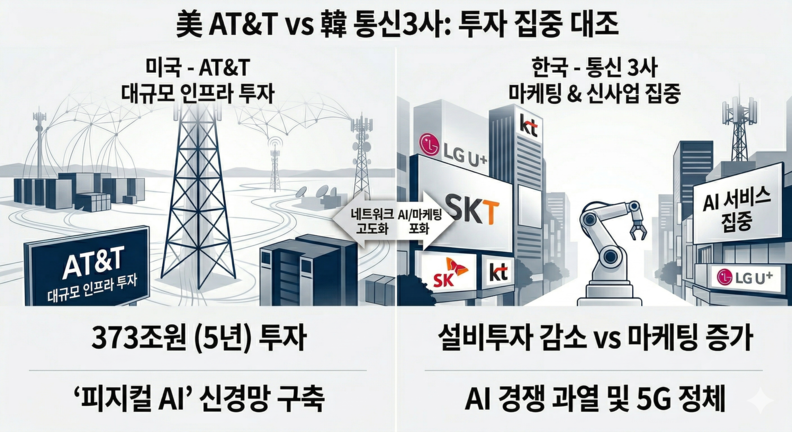 인싸잇=이다현 기자ㅣ미국 최대 통신사 AT&T가 향후 5년간 2500억 달러 (약 373조 원) 규모의 초대형 통신 인프라 설비투자(CAPEX)에 나선다. 반면 국내 통신 3사는 인공지능(AI) 중심의 사업 다각화와 마케팅에 치중하며 본원적 경쟁력인 네트워크 투자는 줄이고 있어, 다가올 6G(6세대 이동통신) 및 AI 인프라 주도권 경쟁에서 뒤처질 수 있다는 우려가 커지고 있다.