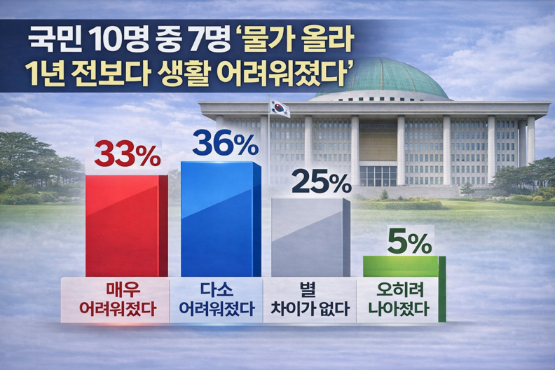 특히 전체의 33%는 “매우 어려워졌다”고 답했고, “다소 어려워졌다”는 응답은 36%에 달했다. 1년 전에 비해 물가 상승으로 생활이 “별 차이가 없다”는 응답은 25%로, “오히려 나아졌다”는 5%를 각각 기록했다.