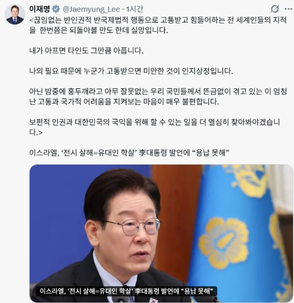 아울러 외교부도 같은날 “대통령의 글은 특정 사건이 아니라 보편적 인권에 대한 신념을 표명한 것”이라며 “이스라엘 측이 이를 오해한 데 대해 유감스럽다”고 밝혔다.