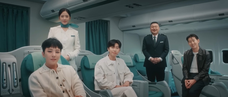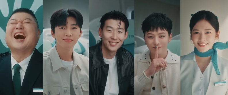 그러면서 <하나 유니버스>의 홍일점인 가수 안유진이 승무원역으로 등장, 비즈니스 클래스 좌석에서 축구선수 손흥민을, 이어 같은 승무원역의 방송인 강호동이 가수 지드래곤, 다시 안유진이 가수 임영웅을 각각 손님으로 맞으며 인사를 나눈다.