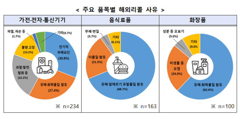 리콜 사유는 가전제품의 경우 감전 등 전기적 위해 요인이 가장 많았고 음식료품과 화장품은 유해 물질 함유가 주요 원인이었다. 실제로 곡물가루에서 곰팡이 독소가 검출되거나 향수에 금지 원료가 포함된 사례도 확인됐다.