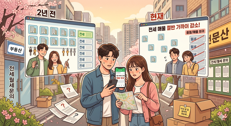 인싸잇=윤승배 기자 | 서울 아파트 전세 매물이 2년 전보다 절반 가까이 줄어든 것으로 나타났다. 이재명 정부의 부동산 정책 시행 이후, 서울 전역이 토지거래허가구역으로 묶이면서 2년 실거주 의무에 ‘갭투자’(전세 끼고 매수) 원천 차단의 영향이 큰 것으로 분석된다. 무엇보다 매물 잠김으로 전·월세 가격도 오르는 동시에, 대출 규제로 매매 가격 상승도 부추기면서 청약통장 가입자도 큰 폭으로 줄고 있다.