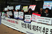 대한민국지킴이연대를 비롯해 자유진영 단체들은 26일 여의도 국회의사당 앞에서 천안함 3주기를 맞아 전사한 46명의 해군 장병들과 UDT의 전설 한주호 준위의 명복을 기원하는 기자회견을 가졌다. 이들은 천안함 폭침으로 전몰한 장병과 한주호 준위를 추모하고, 반국가 및 이적단체의 척결을 강력히 주장했다. 아울러 한미전시작통권 전환은 전쟁위협이 사라질 때까지 연기할 것과 한미우호동맹을 더욱 공고히 할 것을 촉구했다. 이날 단체들은 성명을 통해 “대한민국을 겁박하는 북한의 반민족적 범죄행위에 대해 강력히 규탄한다”고 밝혔다. 이와함께 “북한은 수백만명의 인민이 기아로 죽어가는 데도 핵무기 개발을 숨기기 위해 ‘6자회담’을 하는 척하면서 시간을 끌고 핵무기 및 대륙간탄도미사일 실험을 하고 있다”고 비판했다. 특히 “북한 김정은 체제를 두둔하는 정파는 즉각 해체해야 하고 한국사회에 기생하고 있는 종북 좌파 세력은 스스로 과오를 인정해 전향하거나 아니면 북한으로 자진 월북해야 한다”고 주장했다. 또 자유진영 단체들은 “한미간의 상호방위조약에 기초해 한반도의 평화와 안정을 위해 노력하는 한미 간의 군사동맹에 대해 적극 지지하며, 자위적 차원의 연례 한미군사훈련에 대해서도