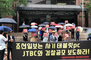 장맛비에도 태블릿PC의 진실을 밝히려는 애국 시민들의 노력은 계속됐다. 'JTBC 태블릿PC 조작보도‧검찰공모 관련 특검추진 및 진상규명위원회'(공동대표 오영국·도태우·김경혜, 약칭 태블릿 특검추진위)가 26일 오후 4시 서울 중구 조선일보에서 ‘태블릿 보도 촉구’ 기자회견을 열었다. 이들이 조선일보 앞에서 연 기자회견만 이번이 세 번 째다. 이날 오영국 공동대표는 “현재 대한민국이 썩어가고 있지만 가까운 시간안에 애국 국민들의 의견이 반영될 수 있는 새로운 세상이 펼쳐질 것”이라며 “보수 우파라는 조선일보라면 태블릿PC의 진실을 제대로 보도해 주길 부탁드린다”고 말했다. 관련기사 : 태블릿 특검추진위, “중앙일보는 결자해지 정신으로 태블릿 진실 보도하라” 태블릿 특검추진위, “조선일보, 왜 태블릿 사건 보도 안하는가… 사기탄핵 공범인가” 태블릿 특검추진위‧땅끄TV “자한당, 탄핵과오 인정하고 태블릿 특검 올인해야” 자유한국당 앞에 24시간 천막 설치돼… “황교안, 태블릿 망언 사과하고 특검 당론화 하라” 태블릿 특검추진위, 조선일보서 “JTBC‧검찰 공모 태블릿PC 사건 보도하라” 촉구 태블릿 특검추진위, 중앙일보‧황교안에 태블릿 망언 인터뷰 해명 촉구