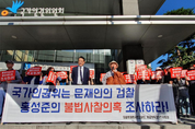 변희재 미디어워치 대표고문과 태블릿 특검추진위(공동대표 오영국·도태우·김경혜)가 국가인권위원회(이하 인권위)에 찾아가 태블릿 재판 홍성준 검사의 피고인 불법사찰 혐의를 조사하라고 촉구했다. 변 대표고문과 태블릿 특검추진위는 18일 오후 4시, 서울 중구 명동성당 근처에 위치한 국가인권위원회 앞에서 기자회견을 열고 “국가인권위는 문재인의 검찰 홍성준의 불법사찰 의혹을 즉각 조사하라”라고 목소리를 높였다. (관련기사 :“태블릿 재판 홍성준 검사 불법사찰 의혹 조사하라” ... 변희재, 국가인권위 제소) 앞서 홍 검사는 태블릿 재판 1심에서 변 대표고문이 대기업 등을 협박해 수 억원의 광고비를 지원받았다는 내용의 허위음해성 의견서를 재판부에 제출했었다. 최근에도 홍 검사는 태블릿 재판 2심에서는 변희재 고문이 참석 출연한 태극기 집회, 유튜브 방송 등의 내용을 시비하면서 변 고문에 대한 보석취소신청서를 제출하기도 했었다. 이에 변 대표고문은 지난 10일, 홍 검사의 불법사찰 혐의 조사를 촉구하는 내용의 제소장을 인권위에 제출했다. 이날 기자회견에서 마이크를 잡은 변희재 미디어워치 대표고문은 “(이번 사건은) 검찰에서 홍 검사를 구속시켜도 전혀 문제가 없을 정도로