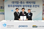 8회 아이디어 마켓플레이스 개최, 포스코 육성 9개 벤처기업 사업설명회 개최2011년부터 40개사 66억원 직접 투자, 132억여원의 외부연계 투자 이끌어 포스코가 자체적으로 벤처기업을 육성하는 것을 넘어 민관합동으로 추진하는 벤처활성화 지원사업에도 참여해 창조경제 실현에 앞장선다. 포스코는 25일 서울 포스코 센터에서 제8회 아이디어 마켓플레이스를 개최하고 미래창조과학부, 벤처기업협회와 함께‘대기업-중소,벤처기업 창조경제협력’을 위한 협약식을 체결했다. 이날 행사에는 권오준 회장을 비롯해 최양희 미래창조과학부장관, 남민우 벤처기업협회장, 투자자와 예비창업자 등 200여명이 참석했다. 이 협약식에 따라 포스코는 대기업을 대표해 벤처기업협회 소속 유망 스타트업기업에 ▲기술창업 지원 ▲기술협력 ▲전략적 투자 및M&A, ▲공동 글로벌 마케팅 등을 포괄적으로 지원하기로 했다. 포스코는 그동안 아이디어 마켓플레이스를 통해 벤처기업 육성 사업을 모범적으로 전개해 이번 ‘대기업-중소·벤처기업 창조경제협력’사업자로 선정돼 벤처기업 육성 노하우를 전부 전수할 계획이다. 포스코는 우선 기존에 운영하던 아이디어마켓 플레이스를 확대해 기술창업 지원 대상을 대폭 늘린다. 특히 벤처