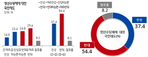 최근 서울시와 성남시 등이 추진하기로 발표한 ‘청년수당제’에 대해 반대 여론이 절반 이상인 것으로 조사됐다.19일 리얼미터가 발표한 자료에 따르면, ‘청년수당제’ 반대 의견이 전체 응답자의 54.4%로 나와 찬성(37.4%)보다 17.0%p 더 높게 나왔다.찬성과 반대 의견 비율을 지역별로 보면, 서울(찬성 35.3% vs반대 61.7%), 부산•경남•울산(32.7% vs 60.8%), 대전•충청•세종(27.5% vs 56.9%), 경기•인천(39.5% vs 49.2%) 등 서울과 경기 지역을 포함한 대부분의 지역에서 찬반 격차를 보였다.반면, 광주•전라(45.9% vs 45.6%), 대구•경북(52.7% vs 45.2%)에서는 두 의견이 오차 범위 안에서 팽팽했다. 연령별로는 50대(찬성 22.2% vs반대 72.5%)와 60대 이상(23.5% vs 66.3%)에서는 반대 의견이, 20대(53.2% vs 38.5%)에서는 찬성 의견이 우세했다. 30대(44.6% vs 47.6%)와 40대(46.8% vs 44.1%)에서는 찬반이 오차 범위 안에서 팽팽한 것으로 조사됐다.정당 지지별로