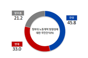 박근혜 정부가 추진 중인 노동시장 유연화와 임금피크제 도입 등 노동개혁 방안을 절반에 가까운 국민들이 지지하는 것으로 나타났다.여론조사 전문기관 리얼미터가 노동시장의 유연화와 임금피크제 도입을 골자로 한 정부의 노동개혁 방향성에 대한 국민들의 태도를 조사한 결과, 정부의 노동개혁 방향에 찬성하는 의견이 45.8%로, 반대하는 의견(33.0%)보다 12.8%p 높은 것으로 조사됐다. ‘잘 모름’은 21.2%였다.지지정당별로는 새누리당 지지층(찬성 75.0% vs 반대 11.1%)에서는 찬성 의견이 압도적으로 우세한 반면, 정의당 지지층(8.5% vs 87.4%)과 새정치연합 지지층(15.0% vs 52.1%)에서는 반대 의견이 압도적으로 우세했다. 어느 정당도 지지하지 않는 무당층(찬성 34.9% vs 반대 41.6%)에서는 오차범위 내에서 정부의 노동개혁 방향에 반대하는 의견이 많았다.정치성향별로는 보수층(찬성 68.1% vs 반대 15.9%)에서는 70%에 근접한 찬성 의견을 보였고, 중도층(찬성 43.1% vs 반대 36.8%)에서는 오차범위 내에서 찬성하는 의견이 많은 것으로 조사됐다. 반면, 진보층(24.0% vs 60.5%)에서는 60% 이상이 반대