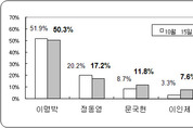 대통합민주신당 정동영 후보, 민주당 이인제 후보, 창조한국당 문국현 후보 등 대선 레이스를 이끌고 갈 범여권 진영이 구축된 것을 계기로 대선정국이 또한번 거세게 요동치고 있다. 이명박 후보의 50%대 지지율이 일부 여론조사에서 붕괴된 가운데 범여권 3인방의 지지율 합계가 40%를 넘보는 수준까지 올라가고 있다. 또한, 50%대였던 한나라당 지지율이 40%대로 급락한 가운데 범여권+민노당의 지지율 합계가 30%를 넘어섰다. 대선후보 지지율은 물론, 정당 지지율에 있어서도 10%대 '박빙 승부'로 양상이 급변하고 있음을 알 수 있다. CBS가 여론조사기관 리얼미터(대표 이택수)에 의뢰해 지난 17일 실시한 조사결과에 따르면 이명박 후보는 50.3%로 이틀 전인 15일보다 1.6% 하락했고, 정동영 후보 또한 20.2%에서 17.2%로 3% 내려간 것으로 나타났다. 그러나, 문국현 후보와 이인제 후보는 각각 11.8%와 7.6%를 기록, 이틀 전의 8.7%와 3.3%보다 크게 상승했다. 이로서 범여권+민노당 후보들 지지율 합계가 올들어 처음 40%선을 넘어섰으며, 권영길 후보를 제외한 범여권 후보들 지지율 합계만으로도 37%를 넘어서 이 후보와의 지지율 격차가 처