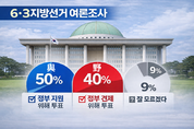 인싸잇=유승진 기자 | 오는 6·3지방선거에서 유권자의 절반이 더불어민주당 후보에 투표하겠다고 답한 여론조사 결과가 나왔다. 대한민국 자유유튜브 총연합회(대자유총, 회장 이영풍·수석부회장 강용석)가 한국여론평판연구소(KOPRA)에 의뢰해 지난 21~22일 전국 만 18세 이상 남녀 1002명을 대상으로 실시한 “6·3지방선거에 투표할 때 다음 입장 중 어디에 더 가까운가”라는 질문의 조사에서 응답자의 50%가 “이재명 정부 지원을 위해 여당 후보에 투표할 것”이라고 답했다. 반면 “정부 견제를 위해 야당 후보에 투표하겠다”라는 응답은 40%에 그쳤다. “잘 모름”이라는 답변은 9%를 기록했다.세부 지표를 살펴보면, 30대와 70세 이상을 제외한 전 연령층에서 여당 투표 의사가 강했다. 먼저 18~29세는 여당과 야당에 대한 투표 의사가 각각 43%와 41%로 팽팽했다. 30대는 야당 투표 53%, 여당 투표 39%로 차이를 보였다. 이어 40대는 여당 투표 의사(65%)가 야당 투표 의사(30%)를 크게 앞섰다. 50대도 여당 투표 61%, 야당 투표 33%로 차이가 났다. 60대에서는 여당 투표 50%, 야당 투표 41% 그리고 70대에서는 여당 투표 40