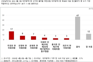 인싸잇=한민철 편집국장 | 6·3지방선거를 앞두고 대구광역시 유권자를 대상으로 실시한 국민의힘 대구시장 후보 적합도 여론조사에서 추경호 국민의힘 의원이 가장 높은 지지율을 기록했다. 또 대구시 유권자 중 절반 이상이 차기 대구시장의 최우선 과제로 미래 신산업 유치와 이를 통한 청년 일자리 창출을 꼽았다. 경기지역 언론매체 <인싸잇경기>가 한국여론평판연구소(KOPRA)에 의뢰해 지난 6~7일 대구광역시 거주 만 18세 이상 남녀 1012명을 대상으로 실시한 6·3지방선거 국민의힘 대구시장 후보 적합도 조사 결과, 응답자의 17%가 추경호 의원을 꼽았다. 이어 유영하 의원(8%)과 윤재옥 의원(7%), 이재만 전 대구동구청장(4%), 홍석준 전 의원(3%), 최은석 의원(3%) 순이었다. 가장 많은 응답은 “없다”로 47%에 달했다. 추경호 의원은 전 연령대에서 가장 선호도가 높았다. 추 의원과 유영하 의원, 윤재옥 의원은 18~29세에서 각각 11%·8%·10%의 지지율을 기록했다. 이들은 30대와 40대에서 각각 13%·6%·6%에 12%·4%·8%, 50대와 60대에서 각각 17%·8%·5%에 24%·10%·8%의 지지율을 보였다. 70세 이상에
