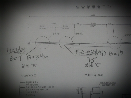 이종철 시의원에 따르면, 애초 설계서에는 일방통행 차도옆의 인도보도 전 구간에 60T의 보도블럭만 설치 시공하도록 설계가 되어 있었다는 것이다.