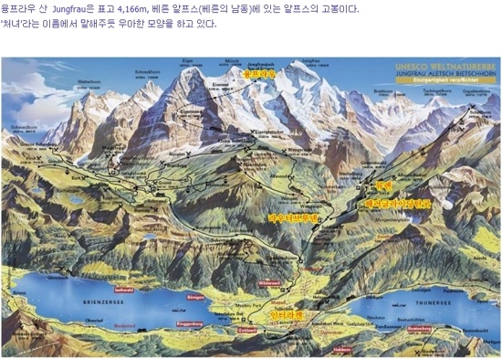왼쪽 사진에서 보듯이 스위스 알프스산에 위치한 융프라우의 높이는 4,158m다.
