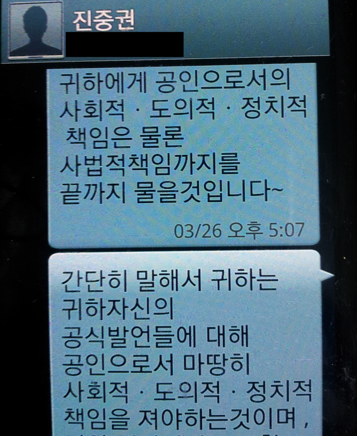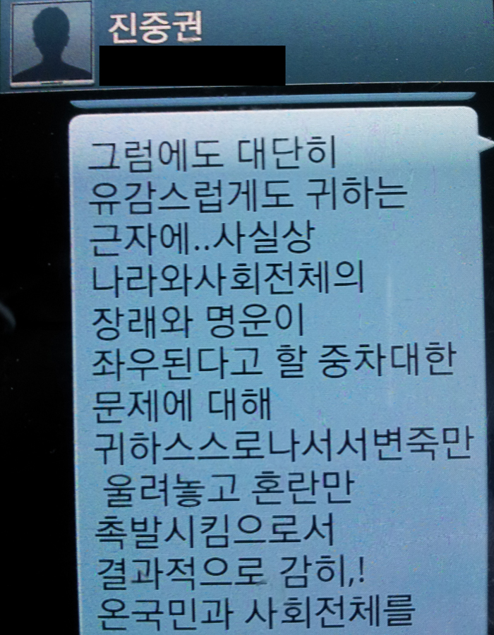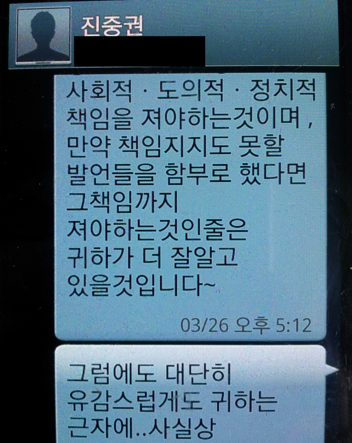 진중권이 만약 자진해서나 검찰공안당국에 불려가서나 누가 봐도 양심적으로 모든것을 낱낱이 털어놓고 있다는것이 충분히 납득이 된다면 그나마 그것으로 그칠것이나, 또다시 잔머리를 굴리거나 허튼 수작을 한다면, 나는 그와는 별도로 그리고 선거결과여하에 관계없이 진중권을 상대로 감히,온국민을 능멸!모독!농락!함으로써 심대한 혼란을 초래케 한데 대하여, 수천만원이상의 손해배상 소송을 제기 할것임을 분명히 공언-경고-통보 해두는 바이다.
