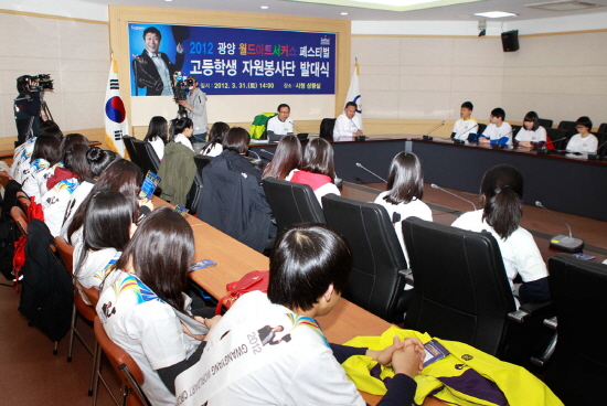 광양월드아트서커스페스티벌 조직위원회는 3월 31일(토) 14시 시청 상황실에서 고등학생 자원봉사단 발대식을 가지고, 발대식 후 자원봉사단들과 함께 중마동 시가지에서 서커스 페스티벌 홍보 퍼레이드를 실시했다.