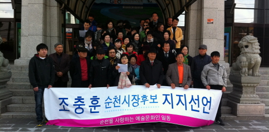 순천시에서 활동하고 있는 연극인, 미술인, 무용인, 국악인등으로 이뤄진 이들은 “조충훈 순천시장 후보가 순천시의 문화예술의 이해와 미래발전을 가져올 가장 적임자라는 판단에서 지지하게 됐다”고 밝혔다.