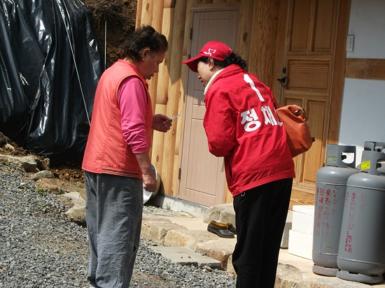 남편인 정 후보가 TV토론 준비를 하느라 외부 지지활동에 나서지 못한 상황에선 별 도리가 없었다.혼자서라도 다닐수 밖에 없었다. 이제는 아예 혼자서 다니기로 했다.
