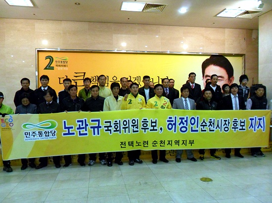 "전국택시노련 순천지역지부는 대한민국 생태수도 순천의 발전과 2013 국제 정원박람회를 잘 준비하여 세계 속의 명품도시로 발전과 비전을 제시할 수 있는 민주통합당 노관규 국회의원 후보와 허정인 순천시장 후보를 적극 지지한다"