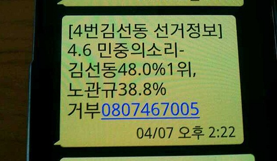 지난 4월 7일 선거일을 불과 4일 앞두고 순천-곡성지역에 유포된 느닷없는 여론조사 결과 문자 때문이다. 통진당의 김선동 후보가 민주당의 노관규 후보를 무려 9.2% 차이로 앞선다는 문자메시지 였다.