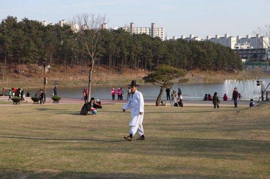 19일 본보에게 제보된 이 사진은 동사연 장채열 대표가 지난 4.11총선기간 동안 조례호수공원에서 한복을 입고 다니며, 민주당 노관규 후보 낙선운동을 펼치고 있는 모습이다.