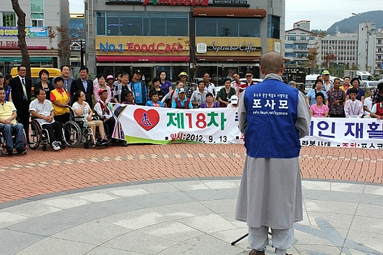 포사모 공동대표인 사띠진명스님은 인사말을 통해 " 오늘 행사를 통해 만난 것도 다 인연이다“고 소개하고 ”이 인연으로 장애인과 비장애인이 서로 소통과 나눔으로 행복한 세상을 만들어 가봅시다"라고 밝혔다.