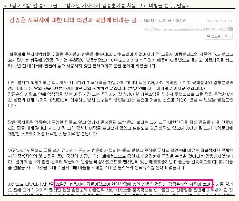 ② 2월 22일 신문 기사에서 김종훈씨를 처음 보고 비방글을 쓰게 되었다는 듯이 글을 올림 (3월 5일 블로그 글)
