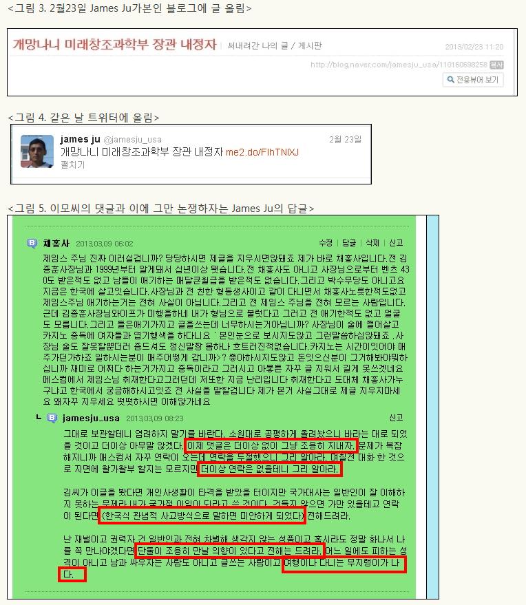 James Ju는김 내정자를 2월 22일 신문 기사에서 처음 보고 본 비방글을 쓴 듯 이야기 했으나 이미 그는 하루 전인 21일 김 내정자를 비방하는 글을 올렸었다. 순서대로 정리하면 아래와 같다.