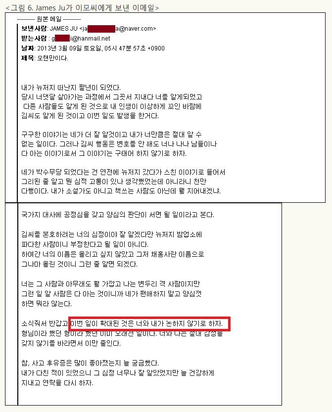 ⑤ JamesJu는 이모씨엑 재차 이메일을보내어 더 이상 이 일을 논하지 말자고 말함 (3월 9일)