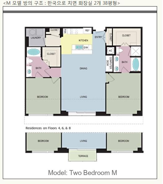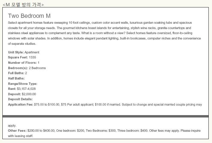 821호를 알아보는 중, 21번 라인의 7층 방이 확인되었는데, 그 방은 1,335 sqft, 2 Bed, M 모델인 것을 알게 되었다. M 모델의 경우 그 방의 내부 구조와 가격은 아래와 같다. 4. M 모델(2 Bed) 호실의 내부 구조와 가격