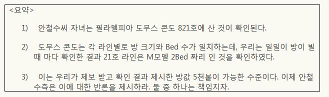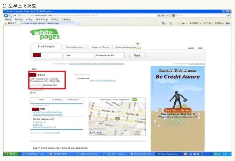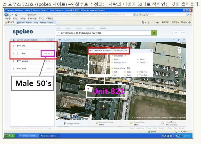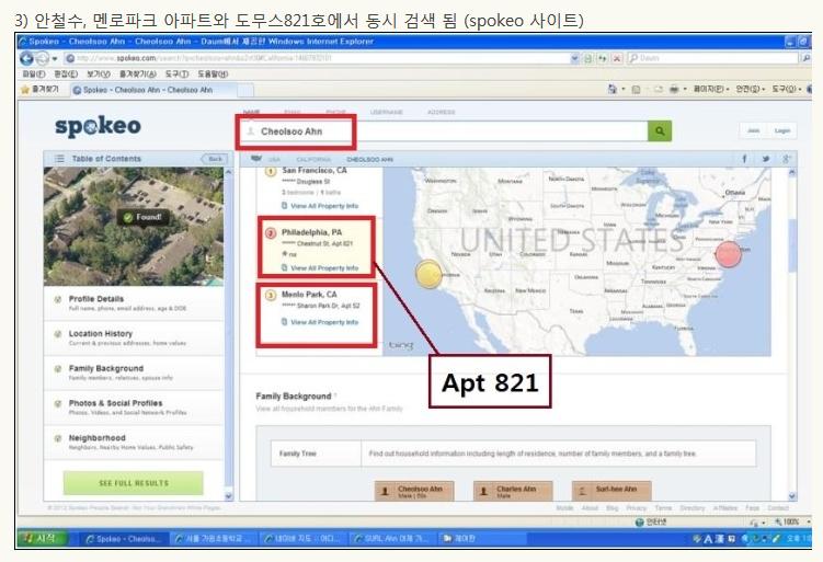 작년 11월 18일 나는 사망유희 토론에서 안철수씨 자녀의 호화 유학 문제를 제기한 바 있다. 이 때 나는 안철수씨 자녀가 유펜 재학시 필라델피아 시내 중심 도무스 콘도 월 5,000불 짜리에 거주하고 있다고 밝혔다. 이에 안철수 측은 말을 바꾸다가 거주 사실을 시인하고, 최종적으로 방 1개짜리 2,000불 내외라고 주장하고는 어떤 증거도 제시하지 않았다. 지난번 멘로파크 아파트 거주 문제도 마찬가지지만 안철수가 말하면 그대로 믿어야 하고 지나가면 모든게 끝난 것인가? 이 도무스 콘도 방 값 문제에는 한 때는 대선후보이고 지금은 정치권에 들어와 새정치를 하려고 하는 인물에 대한 신뢰성이 담겨있다. 작은 부분에서도 진실을 말하지 않으면 어떻게 국가를 위해 정의를 추구할 것인가? 사실 방값 문제는 아무것도 아니다. 하지만 이런 문제에서도 진실을 말하지 않고 말을 바꾸는 것은 왜 그런지 생각해볼 여지가 있다. 1. 안철수의 도무스 관련 말바꾸기과정 ① “펜실베니아 유학했을 때 그 지역 집값을 알아보면 바로 확인이 될 것이다.” - 박선숙 당시 공동선대본부장 발언, 2012. 11. 19 ② “필라델피아 교외는 하우스 렌트도 1,000달러가 안 되는데도 많다.” - 안철수 발언, 조선일보 2012. 11. 19 ③ “월 500만원 임대료는 터무니 없는 수치다. 월 3,000달러 이하다.” - 안 후보 측 발언, 조선일보 2012. 11. 21 ④ “침대 1개 딸린 집에서 살았고, 렌트비는 월 2,000달러 내외였다.” - 오마이뉴스 2012. 11. 22 - 특히 본 기사에서, 안철수측은 렌트비 이체내역은 없고, (아파트 측에서) 이메일로 ‘렌트비 잘 받았다’고답신한 것은 가지고 있으나 프라이버시 보호를 위해 공개할 수는 없다고 말했다. 2. 먼저 우리는 안철수씨 딸이 필라델피아의 고급 콘도 월 5천불짜리 방에 거주한다는 제보를 받았다. 그 제보를 따라 미국 신상정보 사이트에서 확인한 결과, 안철수의 도무스 콘도 거주 기록이 636호, 821호 두 곳에서 나왔다. 왜 두 곳에서 거주 기록이 나오는 지, 그 내막을 알 수는 없으나 어쨌든 도무스 콘도 821호에 안철수 가족이 살았던 것은 분명한 사실이다.