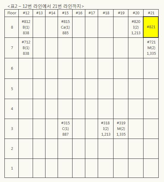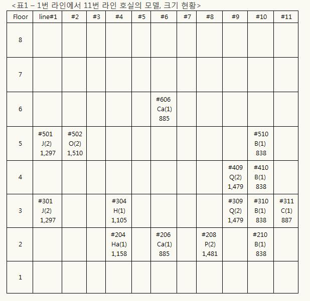 위 자료를 보면 같은 라인은 층 수에 상관 없이 방의 크기, Bed 수, 모델이 같다는 것을 알 수 있다. 예를 들어 6번 라인(6호선)을 보면, 6층과 2층이 모두 885 sqft, 1 Bed, Ca모델인 것을 알 수 있다. 괄호( )안의 숫자가 Bed 숫자를 의미한다.