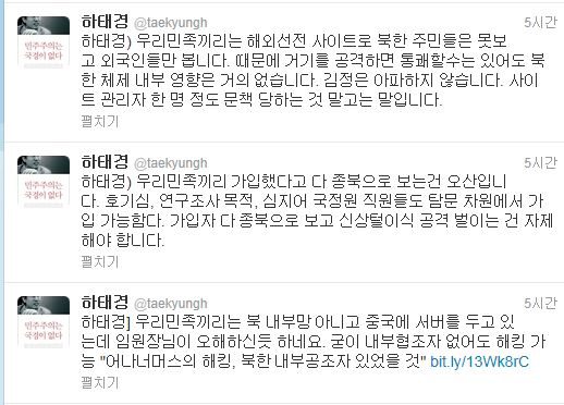 이어 “호기심, 연구조사 목적, 심지어 국정원 직원들도 탐문 차원에서 가입 가능하다”며 “가입자 다 從北으로 보고 신상털이 식 공격 벌이는 건 자제하라”고 충고했다. 또 “우리민족끼리 공격은 통쾌할 수 있어도 북한체제 내부 영향은 거의 없다. 김정은 아파하지 않는다”는 트윗도 날렸다.