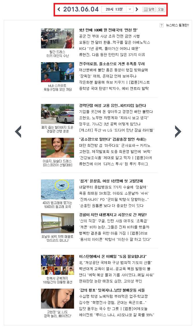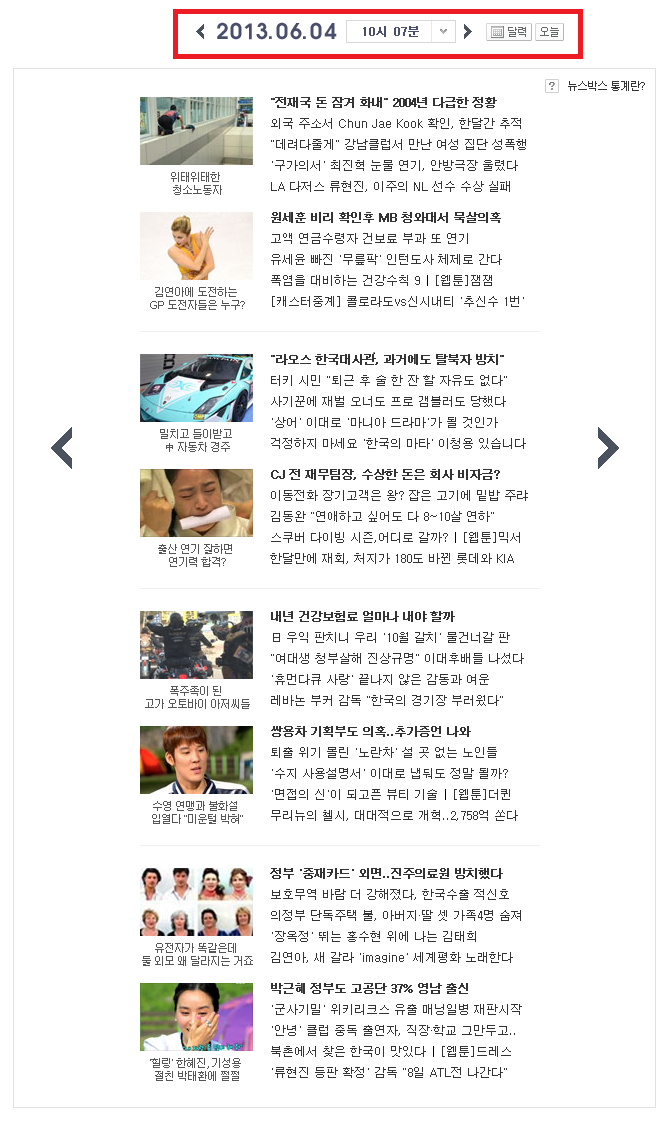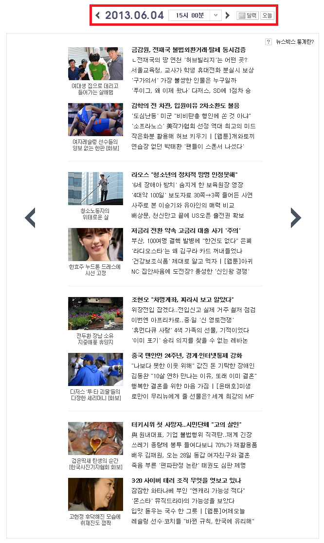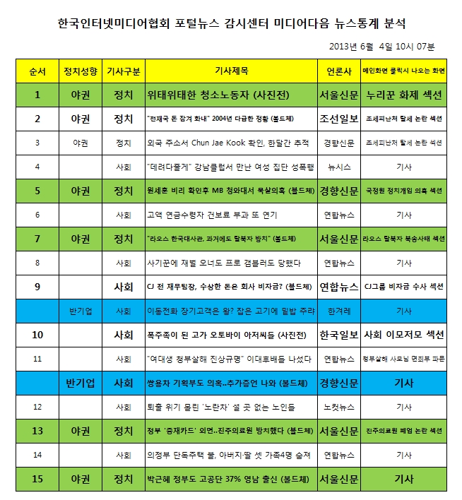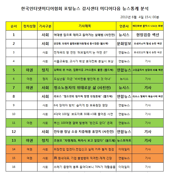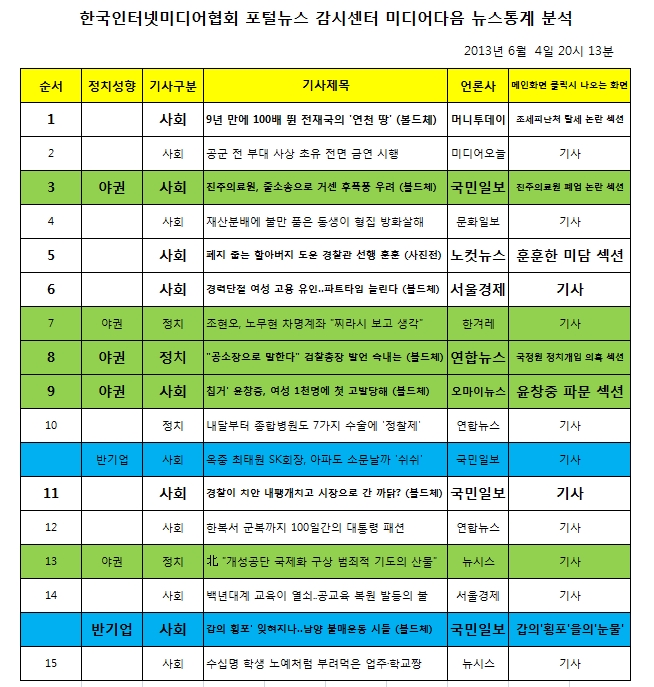 2013년 6월 4일 10시07분,15시00분, 20시13분의 미디어다음 메인화면 뉴스통계 서비스를 분석하였다. 144개의 뉴스 중 정치,사회 기사는 총 46개 였으며, 이중 야권 편향적으로 판단되는 기사는 33%인 15개였고, 이중 볼드체(굵은글씨체)를 사용하거나, 사진을 사용한 기사는 73%인 11개였다. 반면, 여당 편향적으로 판단되는 기사는 4%인 2개 였다. 한편, 144개의 뉴스 중 반기업 정서를 부추기는 기사는 4개가 게재됐다. 미디어다음은 5월 한 달간 국정권 정치개입 의혹섹션, 진주의료원 섹션, 고위공직자 성접대 의혹 섹션, 윤창중 파문 섹션을 메인화면에 지속적으로 게재했다. 6월에 들어선 현재까지도 정부의 이미지를 흠집내기 위한 이슈를 지속적으로 게재하고 있다. 미디어다음의 끈질긴 정부공격 기사 편집 및 게재가 언제까지 이어질지 귀추가 주목된다. 이날은 반기업 정서를 부추기는 기사가 4개 게재되었는데, 노동자 입장을 대변하여 기업을 공격하는 기사가 지속적으로 게재되었다. 특히 ''갑의 횡포' 잊혀지나..남양 불매운동 시들'의 기사에서는 남양유업의 불매운동을 부추기고 있다. 5월 초에 불거진 남양유업 막말사건은 3년 전 녹취된 것으로 1개월간 국민들의 질타를 받았고 남양유업 대표들이 사과하고 재발방지를 약속하였다. 더불어 남양유업기업이미지에 큰 타격을 받았고 매출도 급감하였다. 보통 언론사들이 문제의식을 가지고 한번 기사화 하고 지나가면 그 다음은 언급을 잘 하지 않지만, 미디어 다음은 두달이 다 되어 가도록 하나의 이슈를 집중적으로 이슈화 시키고 있는 것이다. 기본적으로 정당 편향이 없는 기사를 클릭하더라도, 넘어가는 페이지에 막상 가 보면 야권의 주장들을 따로 모아놓은 섹션들이 있는 경우는 야권 편향성으로 분류하였다. 보도기능이 없는 미디어다음의 야권 편향적인 자의적 뉴스 편집은 건전한 여론 형성에 악영향을 미칠수 있으며, 특정사항에 대하여 여론의 왜곡을 야기하여 사회적 혼란을 유발할 수 있기에 정부 당국의 관리가 필요한 실정이다.
