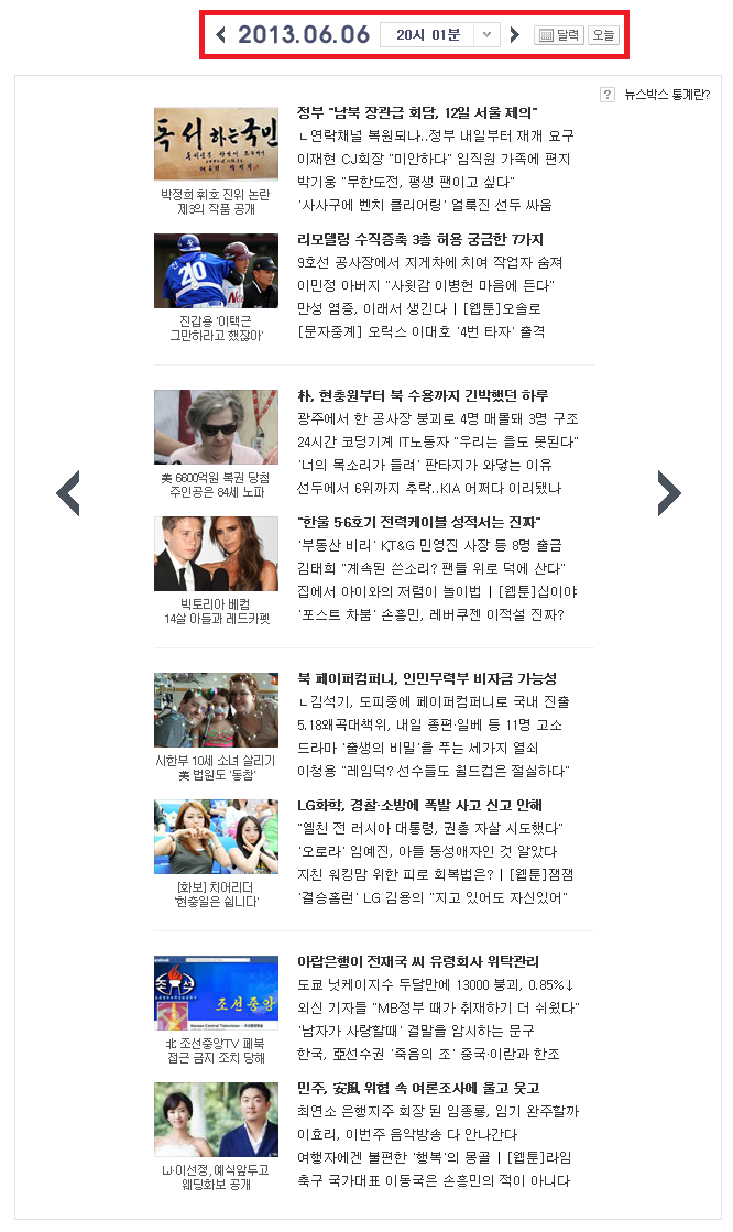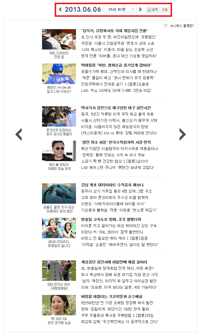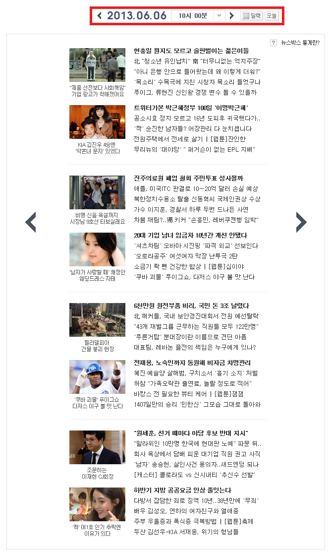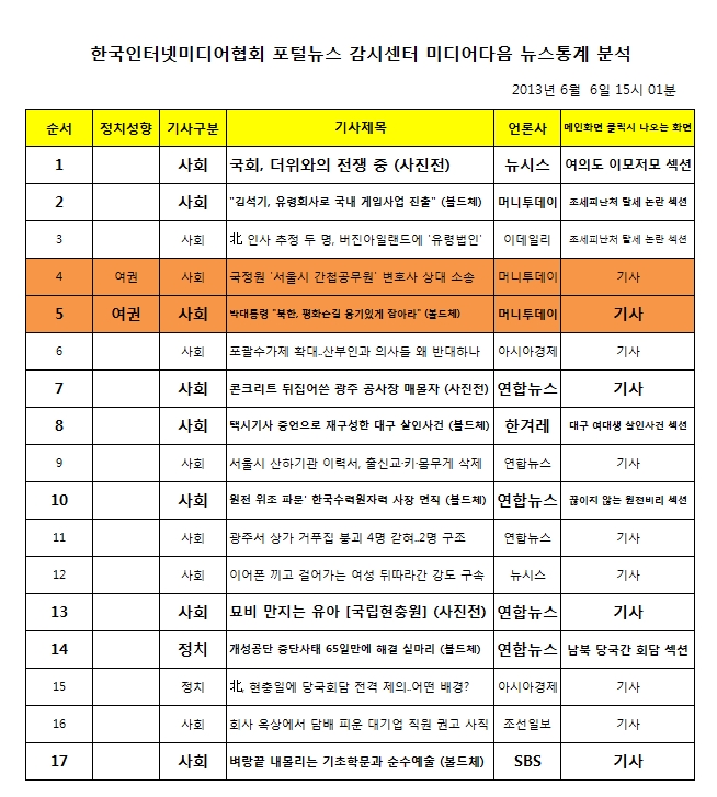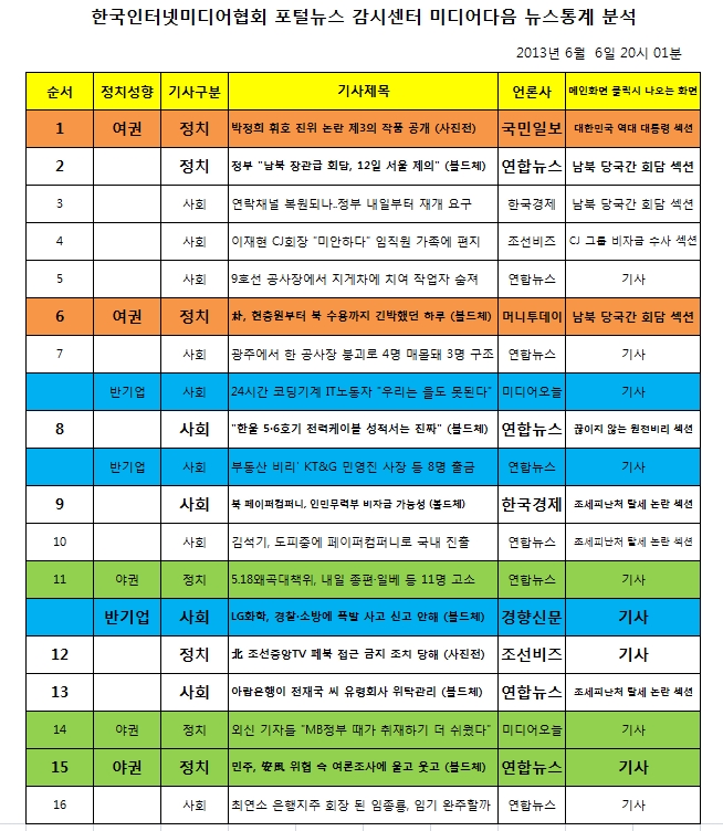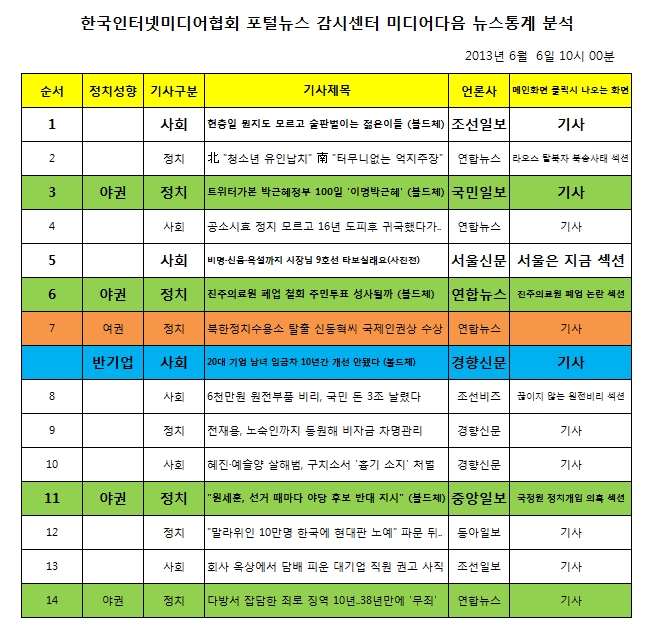2013년 6월 6일 10시00분,15시01분, 20시01분의 미디어다음 메인화면 뉴스통계 서비스를 분석하였다. 144개의 뉴스 중 정치,사회 기사는 총 47개 였으며, 이중 야권 편향적으로 판단되는 기사는 15%인 7개였고, 이중 볼드체(굵은글씨체)를 사용하거나, 사진을 사용한 기사는 57%인 4개였다. 반면, 여당 편향적으로 판단되는 기사는 11%인 4개 였다. 한편, 144개의 뉴스 중 반기업 정서를 부추기는 기사는 4개가 게재됐다.