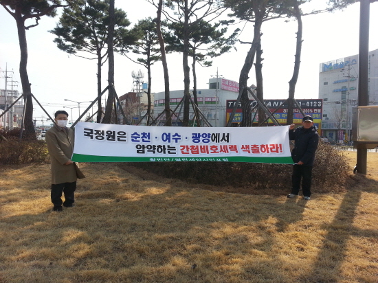 시민단체 활빈단(대표 홍정식)과 열린세상시민포럼은 20일 광양읍 로터리와 순천조례 4거리에서 "순천· 광양· 여수에서 암약하는 간첩비호세력 색출하라!"는 구호가 적힌 현수막을 들고 시위행사를 가졌다. 이들은 통진당 출마자들이 국정원 증거조작 의혹 사건과 관련, "서울시 공무원 간첩사건 당사자인 유우성의 수상한 행각에 대해선 침묵한 채 국정원 해체만을 주장하고 심지어 '내란음모 이석기 RO 사건'도 조작사건으로 은근슬쩍 넘어가려한다"며 통진당을 강력 규탄했다.