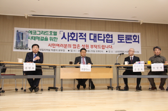 25일 오후 2시 순천에코그라드 호텔 사회적대타협 토론회에 불참한 호텔 낙찰자인 동원산업. 당초 동원산업의 정은집 대표이사는 본보 대표와의 통화에서 토론회에 참가하기로 했으나 무슨 이유로 불참을 통보했고, 대출채권자인 유암코 역시 동원산업 불참을 이유로 참석못한다고 알려왔다. 이날 토론회에는 순천시의회 신민호 시의원, 공사채권단의 유성재 대표, 변호인 측 김성호 사무장이 참가했다.
