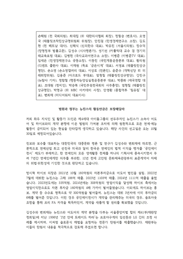 이미, 평소 이재명 대통령을 지지해온 대중문화평론가 김성수씨, 손혜원 전 국회의원, 안진걸 민생경제연구소장은 물론, 이재명 대통령을 비판해온 최대집 전 의협회장, 신혜식 전 신의한수 대표, 이상로 전 MBC기자등 보수인사들 포함 좌우 활동가 32인이, “뉴진스 활동 만큼은 보장해달라”는 탄원서를 우상호 정무수석, 이동연 문화체육비서관, 최휘영 문화체육부장관에게 보내놓았다.