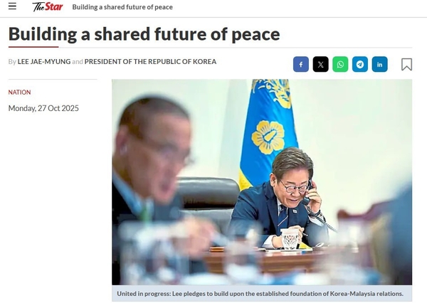 아세안 정상회의 참석을 위해 말레이시아를 방문 중인 이재명 대통령은 말레이시아 매체 ‘더 스타’지에 기고문을 통해 “이번 정상회의에서 한-아세안의 연간 교역액 3천억 달러 달성이라는 과감한 목표와 한-아세안 FTA 개선 협상 개시를 제안하고자 한다"고 강조했다.