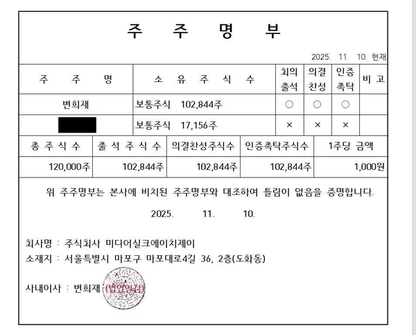 ‘(주)미디어실크에이치제이’의 주식을 구매할 의사가 있으신 분은 오는 11월 30일까지 다음의 정보를 pyein4@naver.com으로 보내주시기 바랍니다. 주식 양수도계약과 관련해서 궁금하신 내용도 이메일로 문의하시면 답변드리겠습니다.