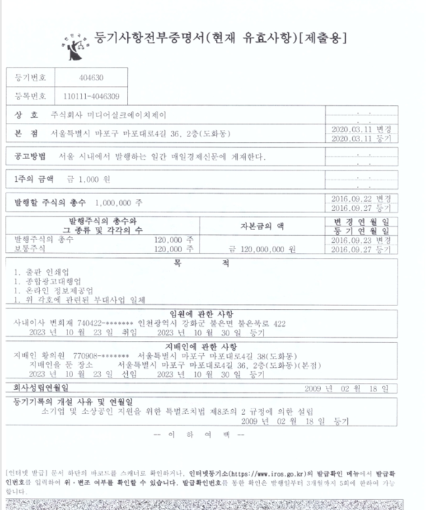 2009년 미디어워치는 초기 자본금 1억원, 즉 1억원의 회사 가치로 출발했습니다. 참고로 미디어워치의 발행 법인은 ‘(주)미디어실크에이치제이’입니다.