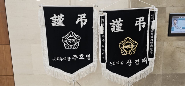 고(故) 황의원 전 미디어워치 대표의 빈소에 주호영 국민의힘 의원과 장경태 더불어민주당 의원의 근조기가 나란히 놓여있다. 고인의 빈소는 연세대 신촌세브란스병원 장례식장 15호실이며, 발인은 20일(목)이다.