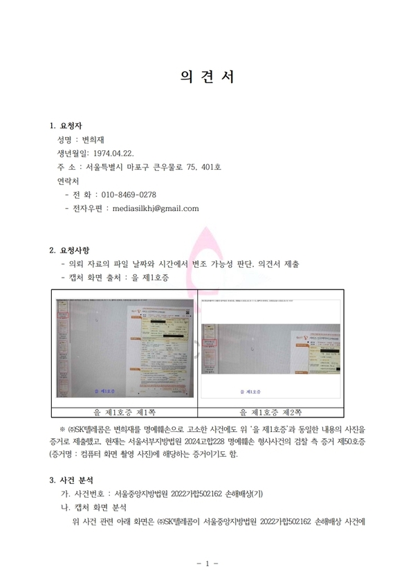 한편, 변 대표는 “검찰과 SKT 측이 포렌식 조사에 동의를 안 한다면, 그게 바로 위조된 계약서를 고객서버에 불법 입력했다는 사실을 자인하는 셈”이라고 주장했다.