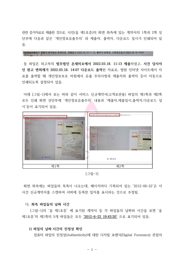 이와 관련, 협회는 “해당 파일이 특정 시점에 특정 출처로부터 생성되었으며, 이후 위변조 없이 원본 그대로 유지되었다는 점을 증명하기 위해 디지털 포렌식 관점에서 통상 활용되는 방법으로 진정성, 무결성, 동일성이 모두 확인되어야만 증거로 사용할 수 있다”면서도 “피고측 변호사가 제출한 파일은 캡처한 자료만 있고 진정성을 입증하기 위한 추가 자료는 전혀 없어 파일의 진정성이 있다고 볼 수 없음”이라고 밝혔다.