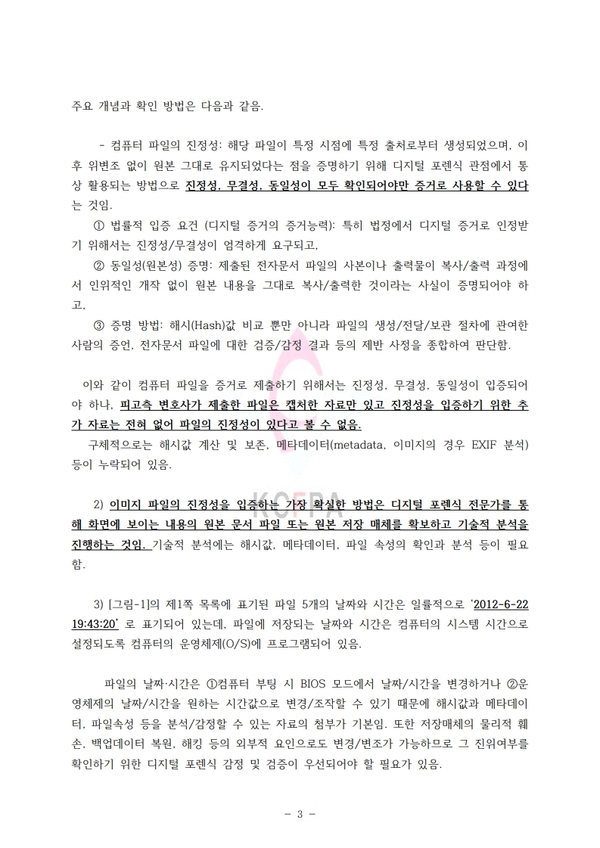 이어 “이미지 파일의 진정성을 입증하는 가장 확실한 방법은 디지털 포렌식 전문가를 통해 화면에 보이는 내용의 원본 문서 파일 또는 원본 저장 매체를 확보하고 기술적 분석을 진행하는 것”이라며 “기술적 분석에는 해시값, 메타데이터, 파일 속성의 확인과 분석 등이 필요함”이라고 덧붙였다.