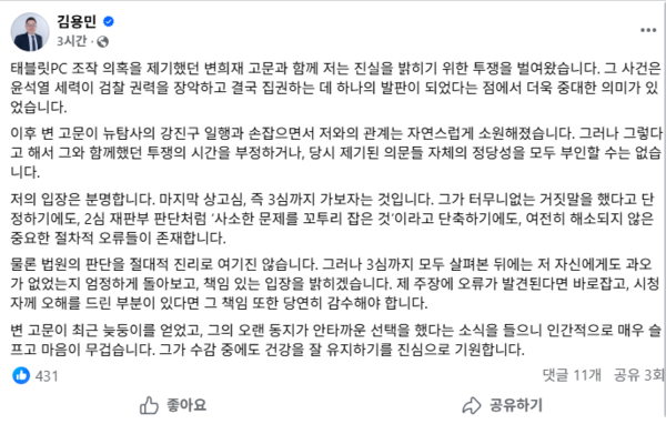 그는 "법원의 판단을 절대적 진리로 여기진 않는다"며 "그러나 3심까지 모두 살펴본 뒤에는 저 자신에게도 과오가 없었는지 엄정하게 돌아보고 책임 있는 입장을 밝히겠다"고 신중한 입장을 취했다.