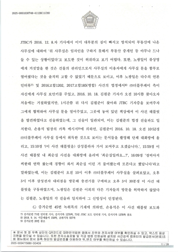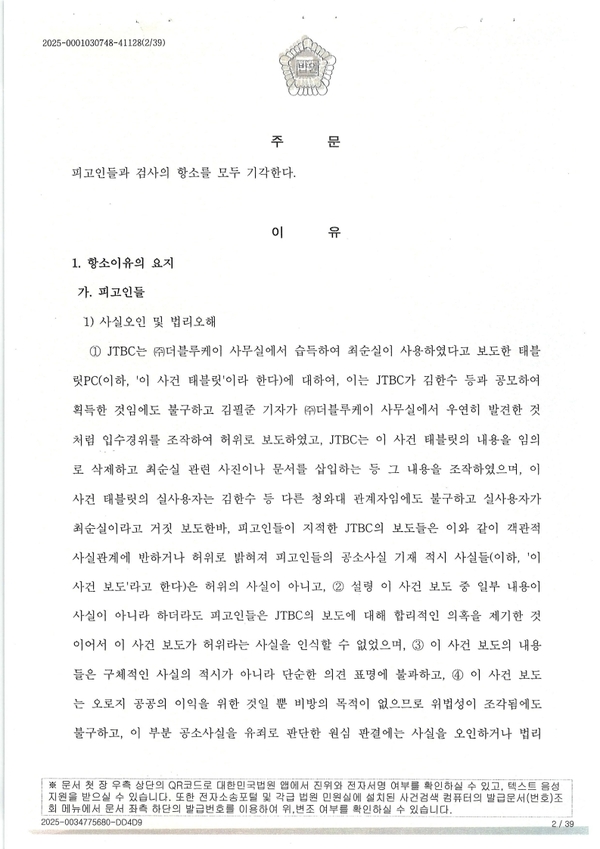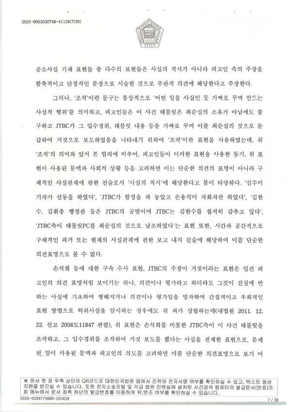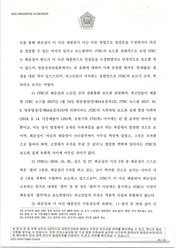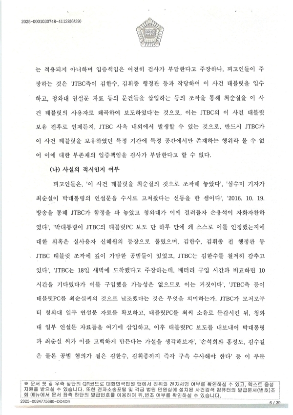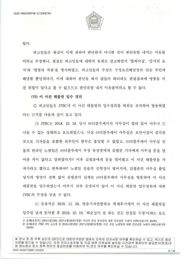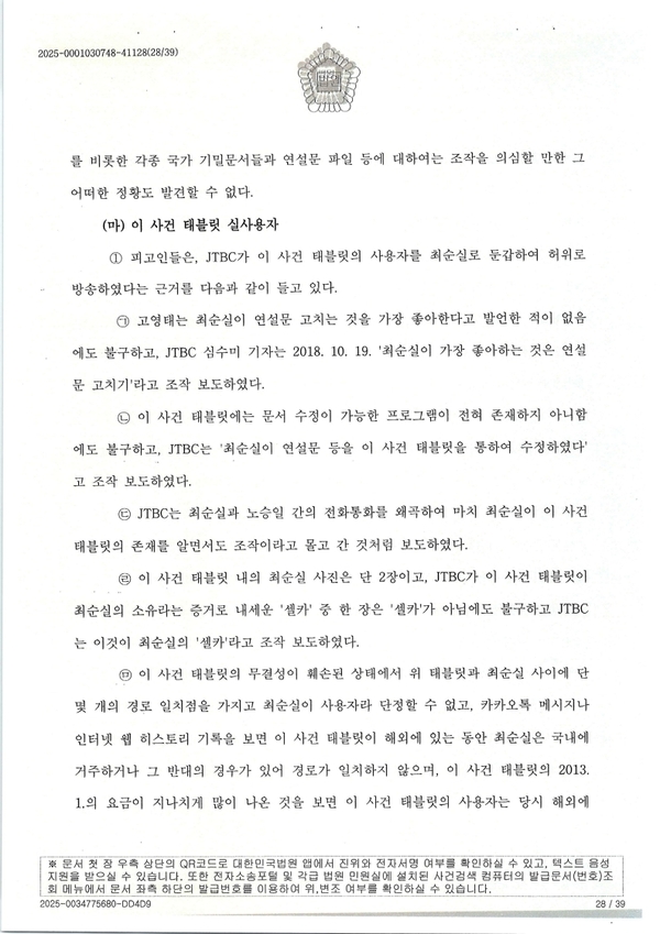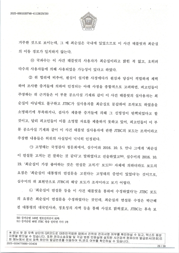 아울러 “JTBC의 보도를 전체적으로 보면 JTBC는 최순실이 반드시 태블릿으로 연설문을 수정하였다고 단정적으로 보도한 적이 없다”며 “피고인들이 지적하는 표현만으로 JTBC의 보도가 조작, 허위라고 보기는 어렵다”고 판시했다.