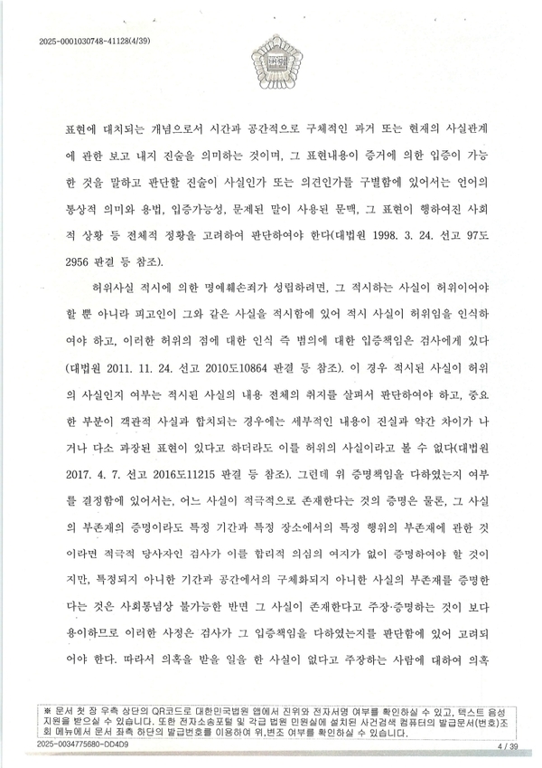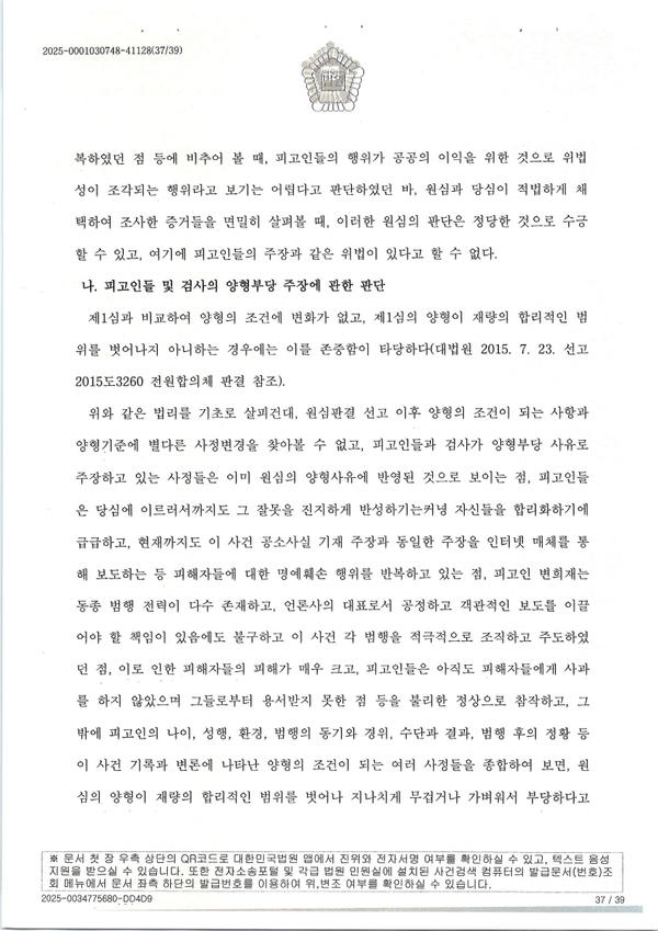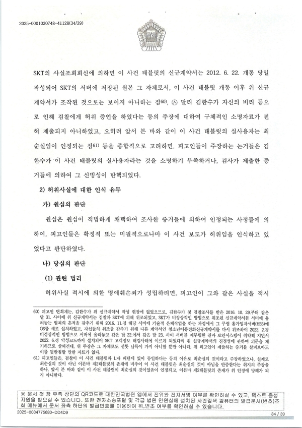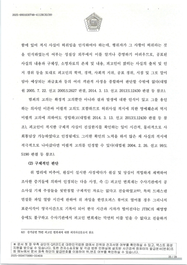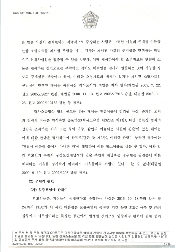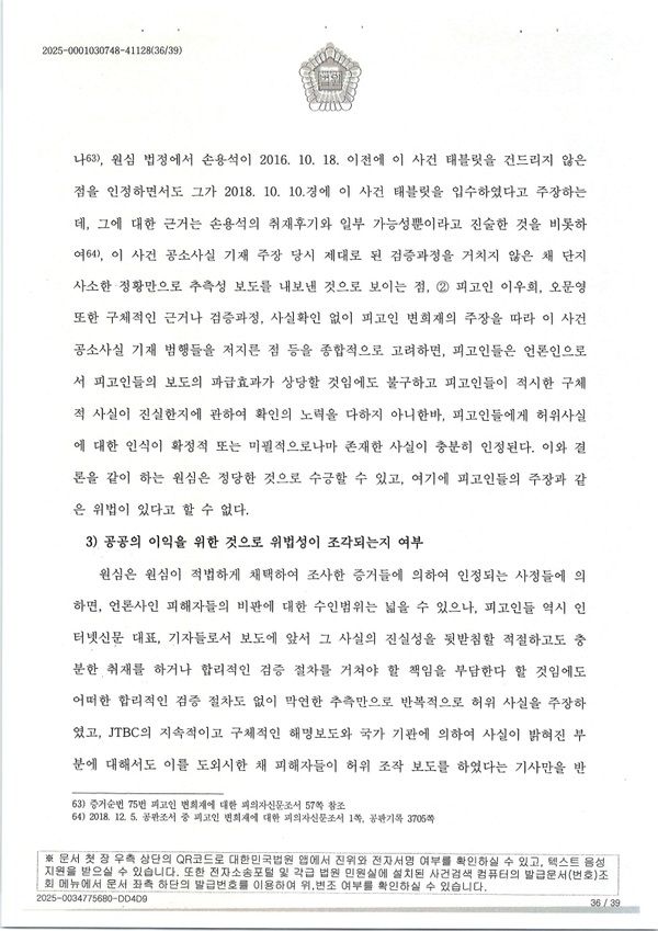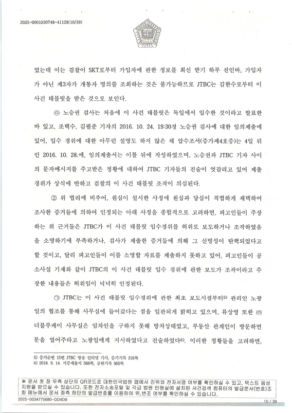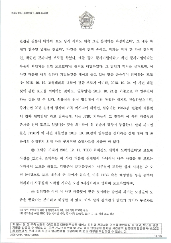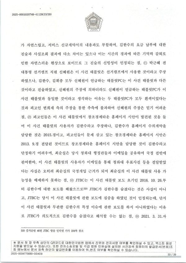 아울러 “JTBC의 보도를 전체적으로 보면 JTBC는 최순실이 반드시 태블릿으로 연설문을 수정하였다고 단정적으로 보도한 적이 없다”며 “피고인들이 지적하는 표현만으로 JTBC의 보도가 조작, 허위라고 보기는 어렵다”고 판시했다.